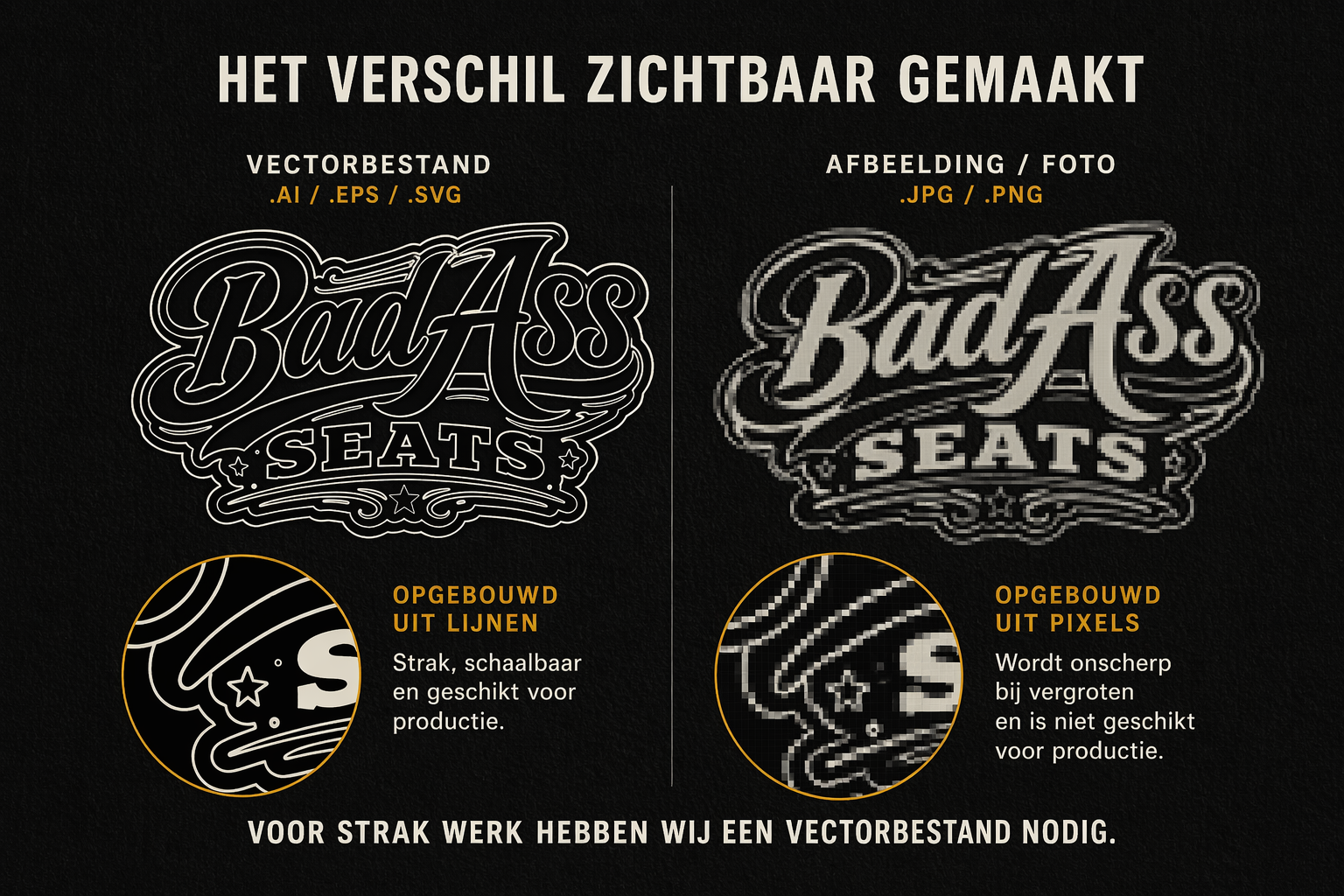 Voor het maken van een stempel of het nauwkeurig aanbrengen van een logo moeten de lijnen exact kloppen. Met een vectorbestand kunnen we dat direct gebruiken.